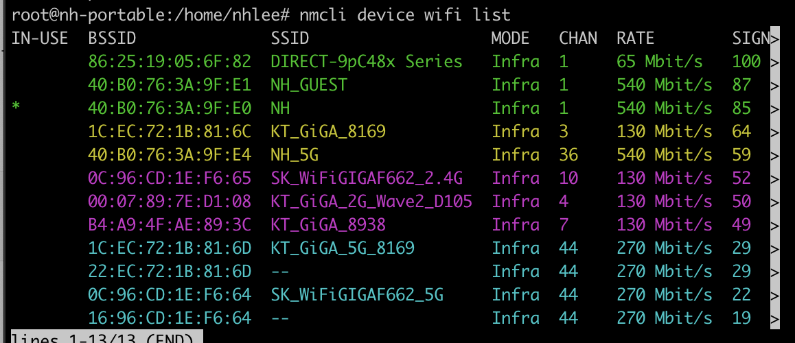 우분투에서 CLI 사용하고있다면 와이파이 연결하기 여간 번거로운게 아니다. 여기서 네트워크 관리는 우분투에 여러가지있다고 알고있지만 저는 Network Manger 를 활용한 방법을 설명합니다. 일반 우분투 패키지에는 Network Manager 가 기본설치 및 실행되고있어 바로 wifi 검색 하여 연결할 수 있습니다. 현재 사용할 수 있는 wifi 리스트를 봅니다. mncli device wifi list 정말 컬러풀하게 친절하게 리스트가 보이며 연결 강도까지 친절하게 보여준다. 여기서 알고있는 SSID 와 비밀번호를 아래와 같이 타이핑하여 연결하면 된다. mncli device wifi connect password 연결이 잘되었다면 캡쳐 화면과 같이 successfully 를 볼 수 있습니다. 그다..