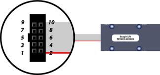The ribbon cable pin order follows the standard convention. The red line indicates the first position. When looking at your Beagle analyzer in the upright position (Figure 38 ), pin 1 is in the top left corner, and pin 10 is in the bottom right corner.