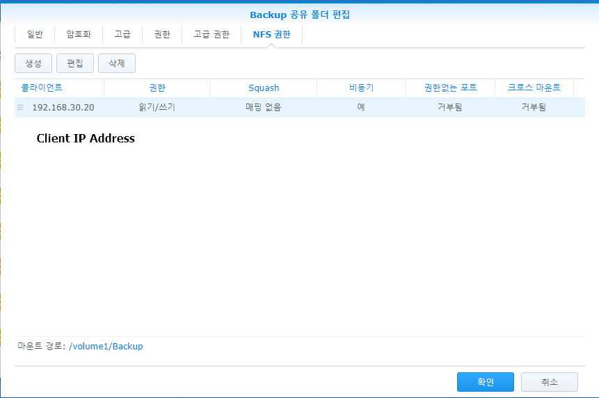 리눅스 , NFS 파일 서버에 접속하기 NFS 서버 설정 1. SYNOLOGY NAS 활용 NFS 클라이언트 설정 1. RASPBERRY PI 접속 vim /etc/fstab 192.168.30.245:/volume1/Backup /home/pi/nfsnfsdefaults 0 0 192.168.30.245 는 Server Address Home/pi/nfs 는 연결한 linux내 주소 sudo mount -a Network 2022.10.07