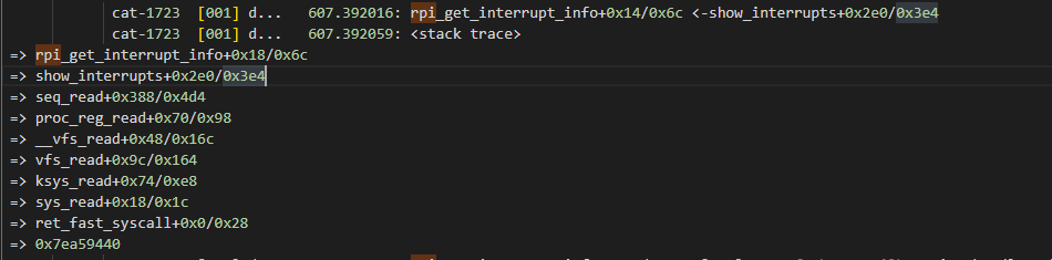 ftrace 디버깅 노트(1), 샘플 pid 1723 인 cat 프로세스가 rpi_get_interrupt_info 함수를 호출한다. 5번째 줄 seq_read() 함수에서 show_interrupts() 함수를 호출 했다. 10번째 줄 sys_read() 함수가 호출됐으니 유저공간에서 read 시스템 콜을 실행했다. Unix & Linux/Kernel 2022.07.11